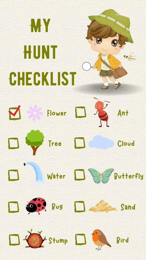 Write in a piece of paper the things you want your child to find. They don’t need be so difficult. It could be simple things like rocks, trees, yellow flowers, etc. Get them to look for those outdoors.